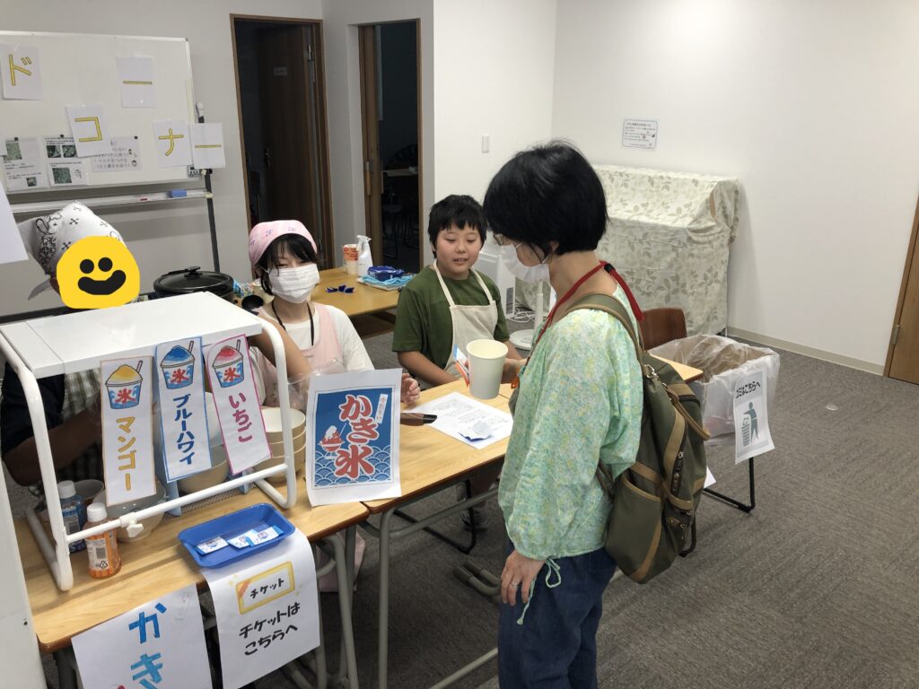 フードコート係は、お客様にかき氷の味を聞いたり、ポップコーンを渡したりと大忙しです。